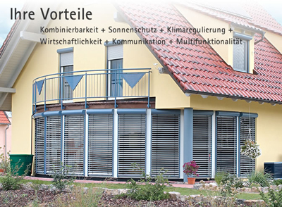 Raffstoren werden in die gleichen Plattform-Systeme eingebaut wie Rolläden. Diese neue Technik erlaubt es auf einfache, aber optisch sehr ansprechende Weise beide Bauelemente zu kombinieren. Rolladen (A) auf der Wetterseite und als Einbruchschutz sowie Raffstore (B) auf der Sonnenseite.